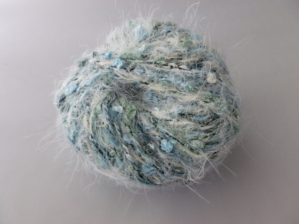 Modella by Laines Du Nord is a chain strand of yarn with small puff's of yarn, twisted with another strand of soft eyelash. Knit this yarn as a component for a soft, confetti effect